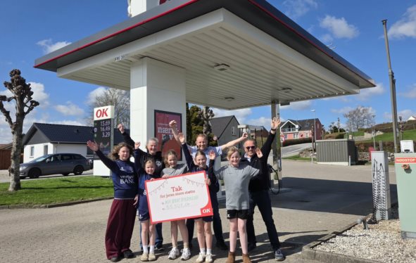 OK Benzin, Dagli Brugsen Klejtrup og I, der tanker på jeres OK Kort eller OK App, bidrager til den skønne check, som Karis Joensen fra Klejtrup Boldklub, her modtager af Karsten fra OK og Lasse fra Dagli Brugen.